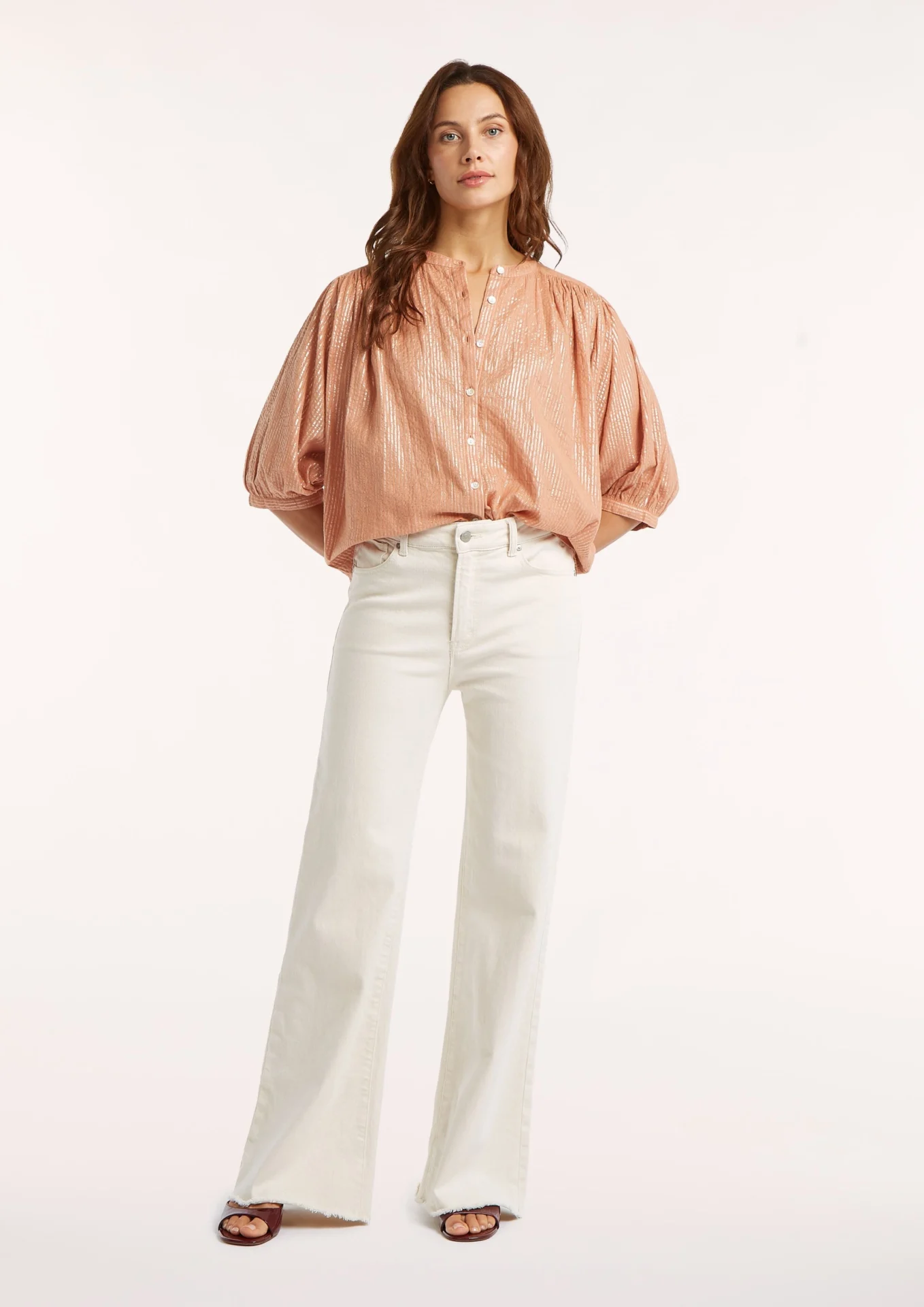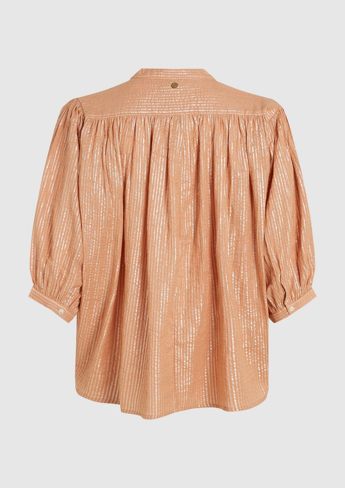 Katoenen dames blouse uitgevoerd in gestreepte oranje met metallic print. De Britt blouse heeft een loose fit, ronde hals met een knoopsluiting en driekwart mouwen. Beschikbaar in meerdere kleuren.