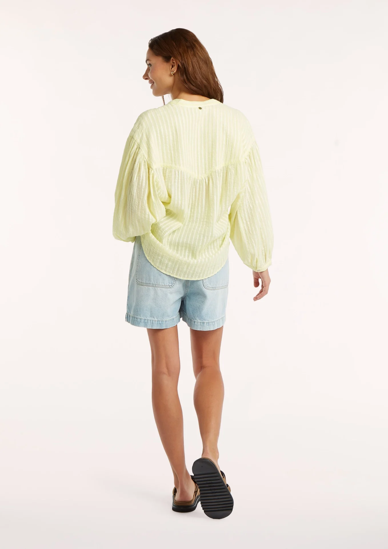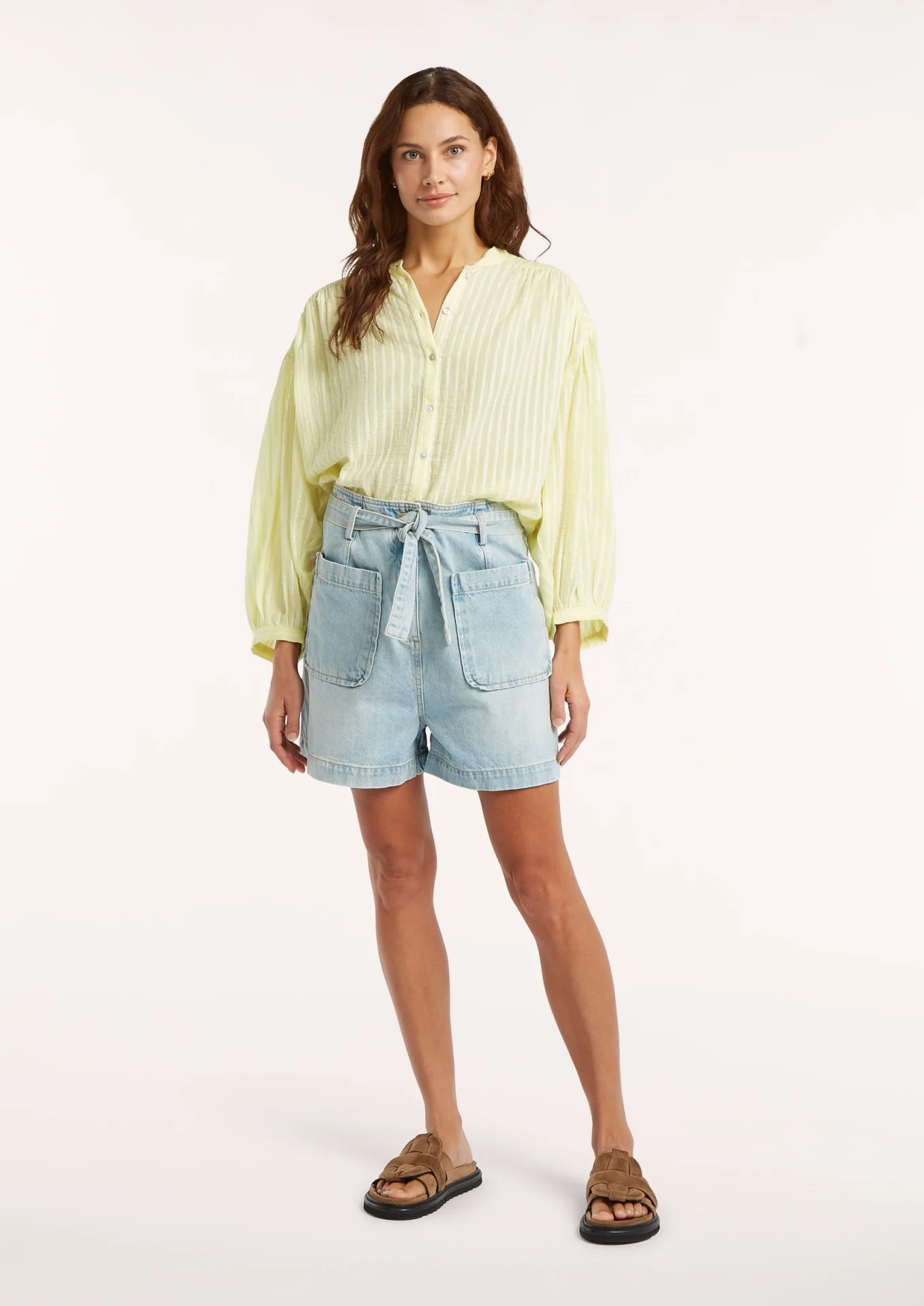 Luchtige dames blouse gemaakt van transparant katoen in een lichtgele tint met metallic details. De Lexi blouse heeft een loose fit met een knoopsluiting en vleermuismouwen met een 7/8ste lengte.