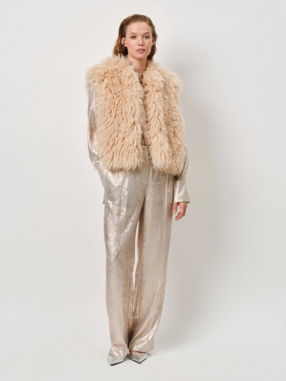 Voeg wat metallics toe aan je broekencollectie met onze stijlvolle Charm broek in de kleur Champagne. Deze metallic straight-leg broek is gemaakt van 100% gecertificeerd gerecycled polyester jacquard. De broek heeft een elastische tailleband aan de achterkant voor extra comfort. Combineer hem met het bijpassende Cathin shirt voor een prachtige co-ord set in DANTE6 stijl.