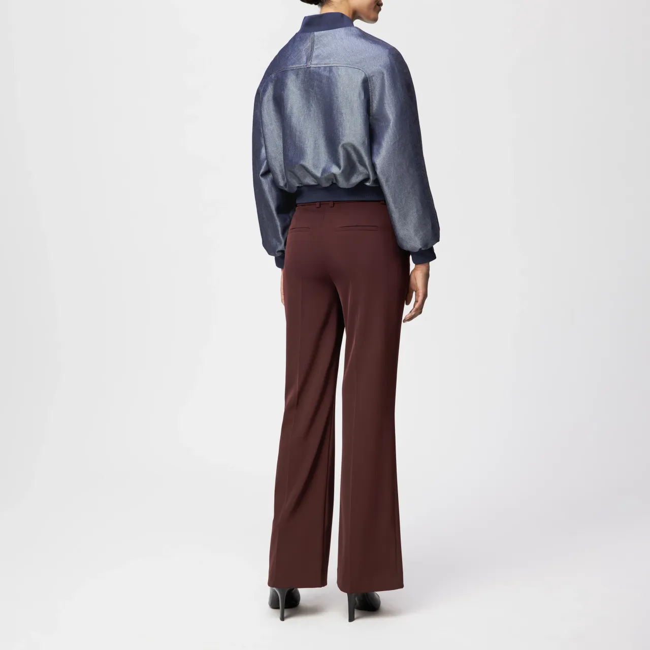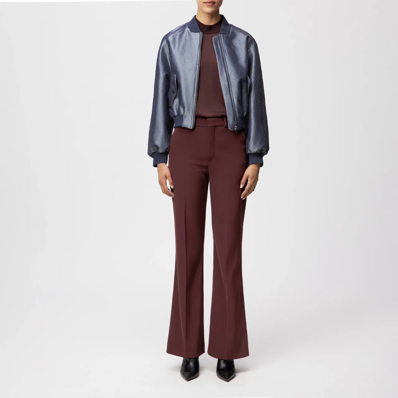 MARHAM is een cropped blousonjas met opvallende geribbelde manchetten. Twee klepzakken aan de zijkanten met drukknopen en een doorlopende rits aan de voorkant maken het ontwerp praktisch. De brede tailleband creëert een gedefinieerd silhouet. De speciale denim met een glanzend oppervlak geeft het materiaal een moderne, bijna metallic look. De stevige structuur zorgt voor een opvallend silhouet met een onderscheidende look.