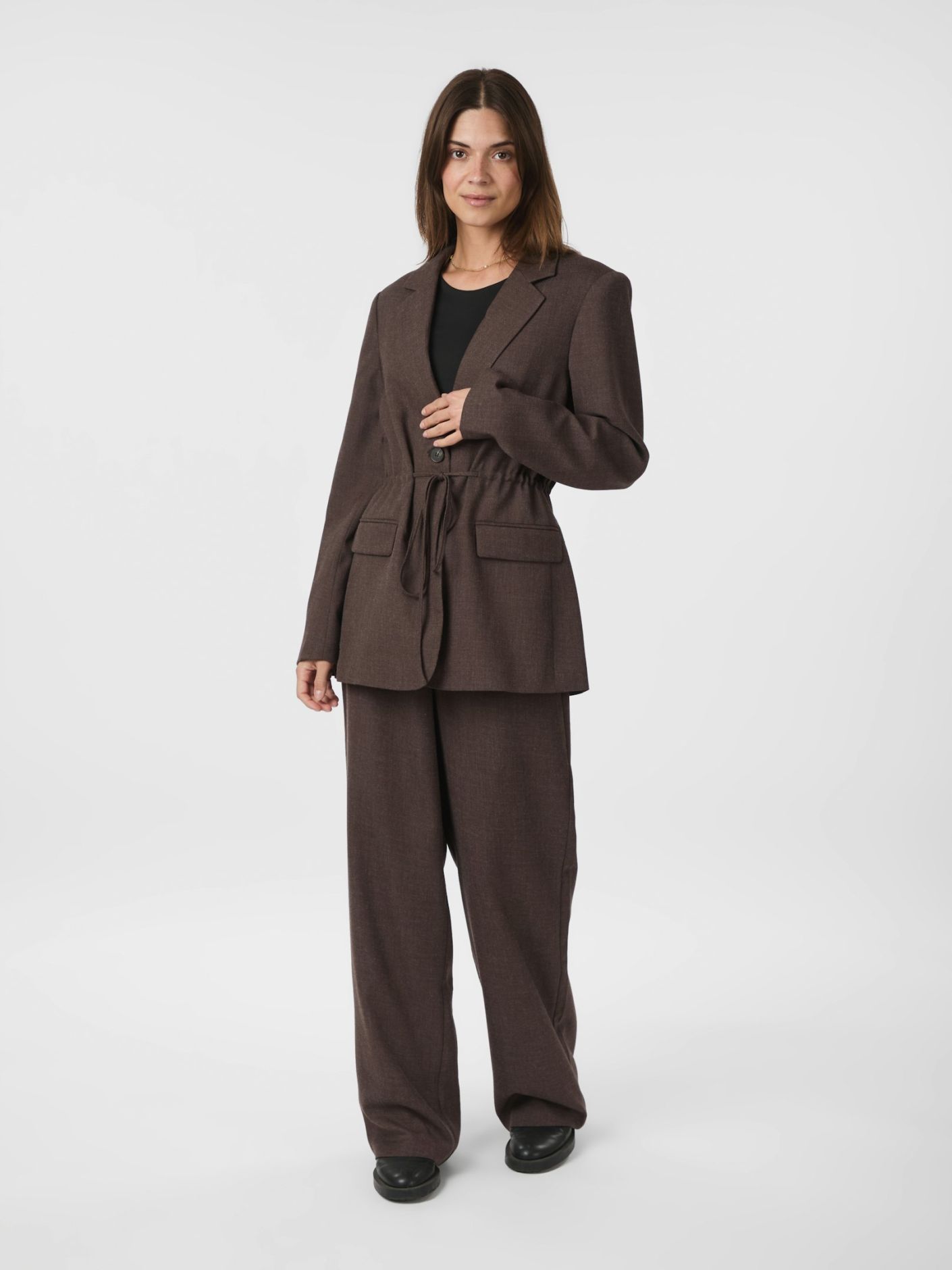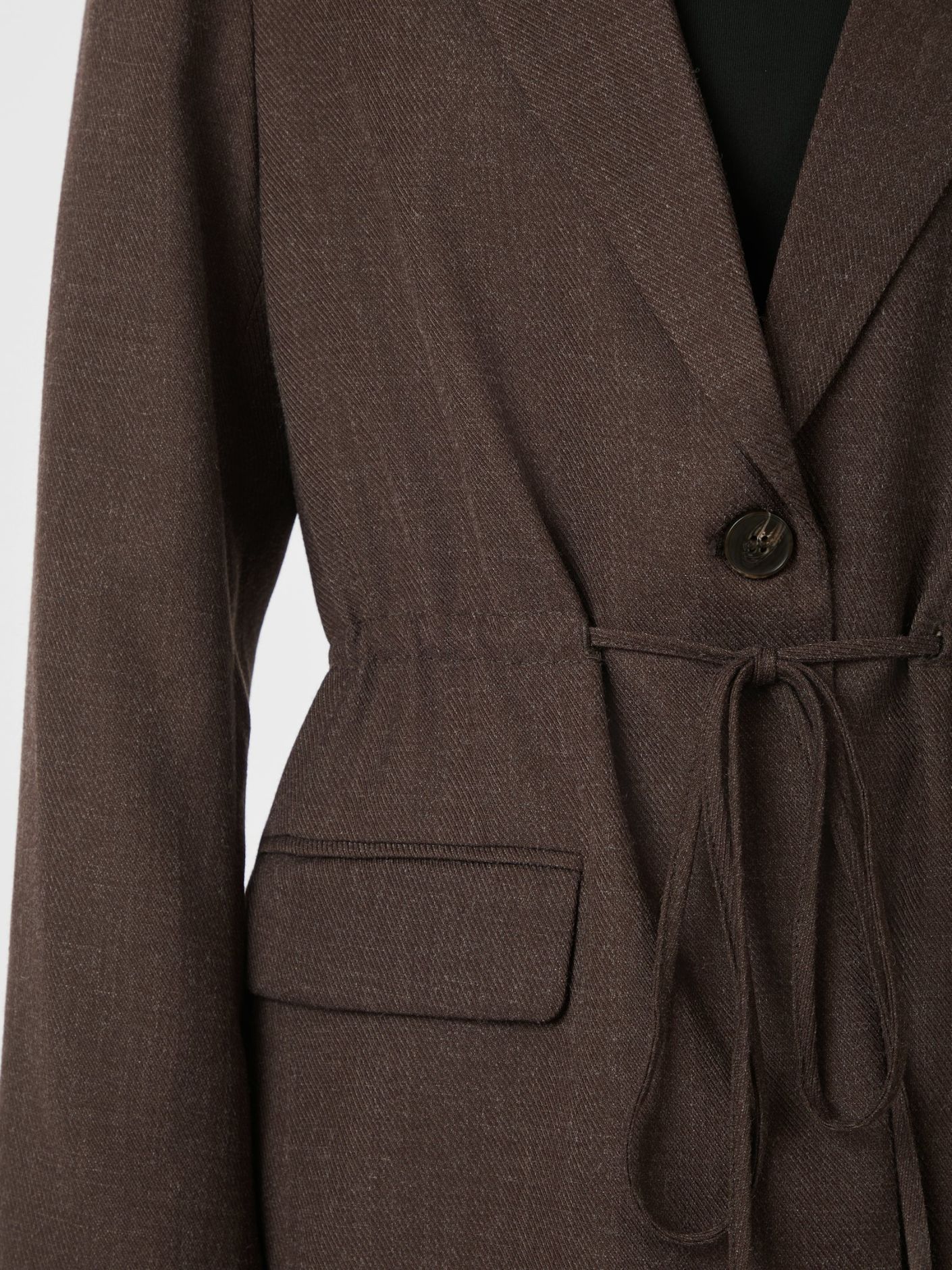 Blazerjasje in een zachte geweven kwaliteit. Het jasje heeft strikbanden voor een moderne, elegante look. Volledig gevoerd. Het model is 176 cm lang en draagt maat 36.
