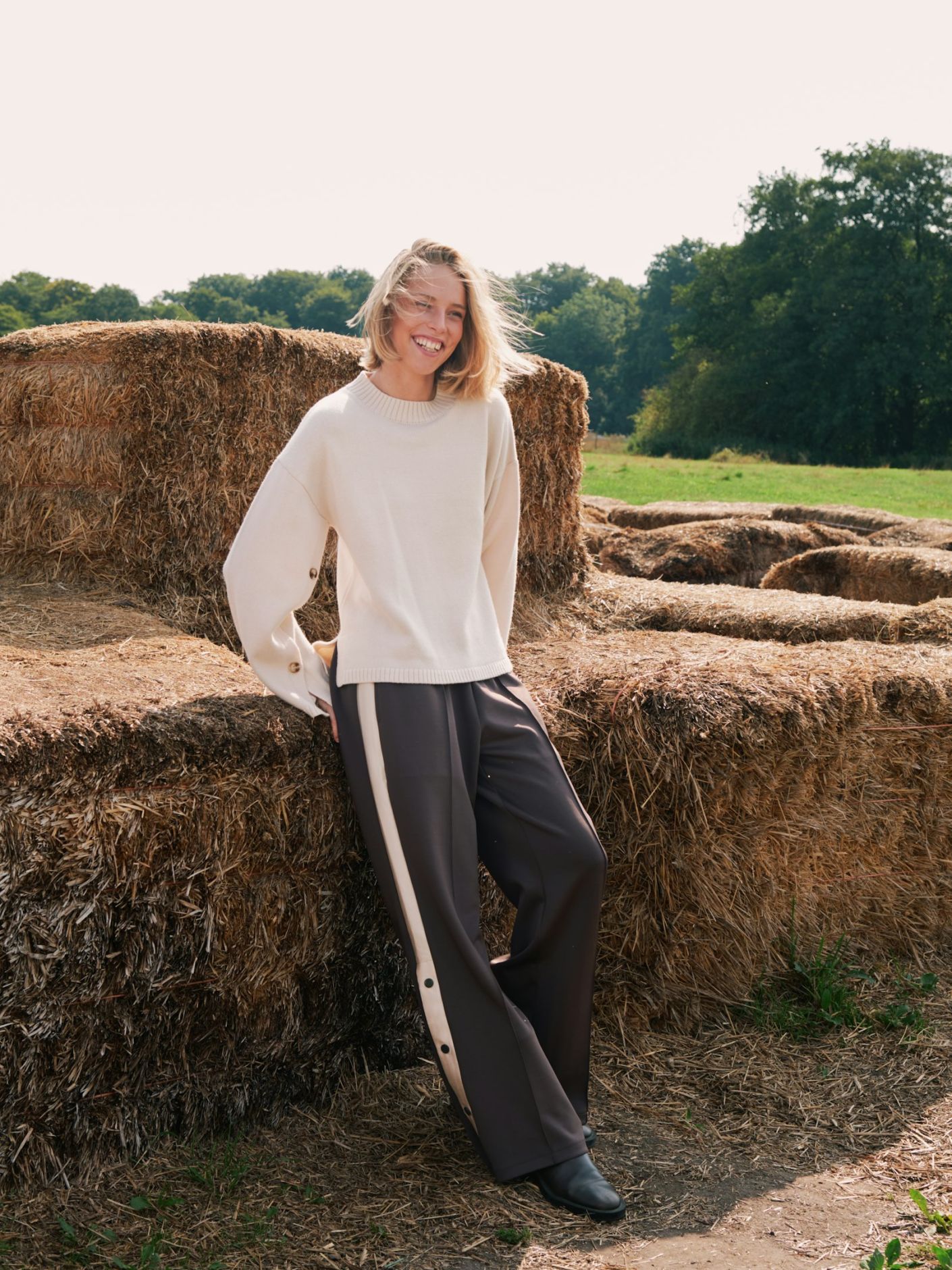 Stoere wijde joggingbroek met streepdetail en knoopjes bij de split in de zijnaad. Het model is 176 cm lang en draagt maat 36.